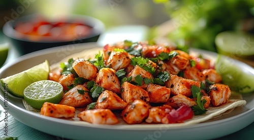 salmon, taco, lime, salsa, cilantro, food, meal, dish, cookery, fresh, herb, cooking, favor, receipe, ingredient, garnish, plate, vibrant, healthy, protein, seafood, spice, texture, colourful, serving, feast, dining, enjoyment, epicure, culinary, nourishment, zest, bite, lunch, dinner, organic, tasty, savoury, delicious, crispy, warm, homemade, platter, presentation, aroma, seasoning