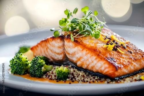 Grilled Salmon with Broccoli and Quinoa on a Matte Black Plate, Illustrating Healthy Food