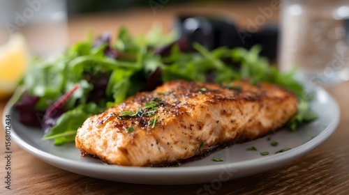 Grilled salmon with fresh greens in a healthy morning light