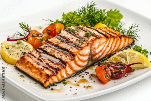 salmon, seafood, fish, lemon, vegetable, tomatoes, red onion, dill, parsley, grilled, seared, fish dish, healthy, protein, omega 3, dinner, lunch, receipe, cooking, white background, plate, eatery, epicure, fresh, delicious, tasty, juicy, flavorful, crispy, cooked, food, cookery, meal, home cooked, healthy eating, diet, nourishment, high-quality, image, culinary, fresh food