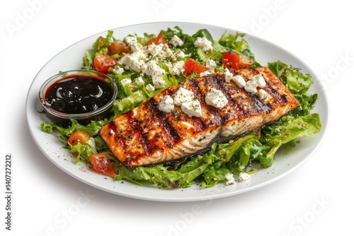 salmon, grilled, salad, lettuce, tomatoes, feta, sauce, bowl, plate, food, meal, dinner, lunch, healthy, diet, protein, vegetable, greener, white background, epicure, culinary, delicious, appetising, nourishment, balanced diet, fresh, cookery, eatery, dish, cooked, food photography, dining, eating, healthy eating, gourmet food, culinary arts
