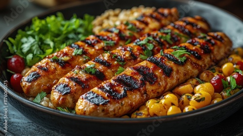 Grilled sausages served with herbs and garnishes on a vibrant plate.
