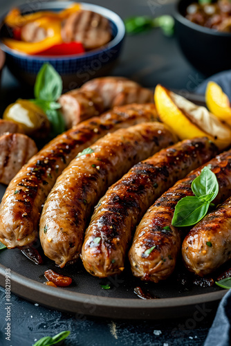 Grilled sausages with vegetables and herbs on a black plate.