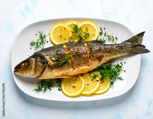 sea, bass, fish, grilled, seafood, lemon, dill, thyme, herb, peppercorn, white, plate, food, cookery, epicure, meal, dinner, lunch, eatery, culinary, presentation, delicious, fresh, healthy, diet, nourishment, cooking, roasted, baked, whole, slice, citrous, yellow, green, red, background, blue, light, table, dish, gastronomy, ingredient, receipe, preparation, studio, shot, closeup, nobody, fine