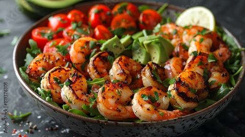 shrimp, salad, arugula, tomatoes, avocado, lime, fresh, grilled, dish, food, meal, vegetable, plate, dinner, meat, healthy, cookery, seafood, chicken, green, epicure, tomatoes, pepper, white, red, lunch, fish, delicious, diet