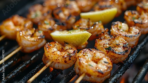 Grilled Shrimp Skewers with Lemon on Barbecue Grill