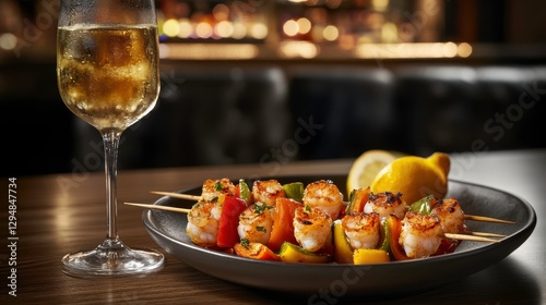 shrimp, skewer, roasted, pepper, onion, natural, light, wooden, table, glasses, wine, lemon, dish, epicure, cookery, meal, food, dining, eatery, fresh, colourful, vibrant, healthy, serving, style, seafood, summer, party, favor, seasoning, plate, elegant, tasty, culinary, presentation, enjoyment, sharing, juicy, cooked, crispy, delightful, savoury