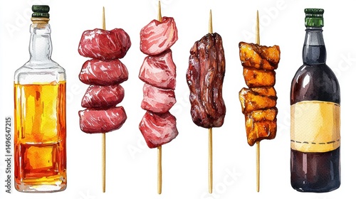 Grilled skewers and bottles of beverages illustration.