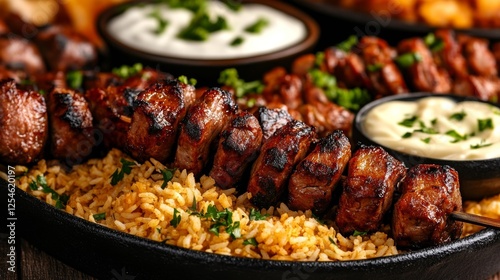 Grilled Skewers with Rice and Sauces for a Flavorful Meal. Generative AI