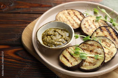 Grilled slices of eggplant with sauce and microgreens on wooden table, closeup