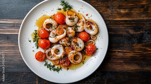 food, dish, meal, dinner, lunch, seafood, squid, ring, grilled, cherry, tomatoes, plate, white, wood, table, dark, background, cooking, receipe, cookery, epicure, delicious, healthy, tasty, snack, eatery, eat, eating, fresh, summer, mediterranean, italian, spice, herb, thyme, pepper, oil, sauce, presentation, top, view, overhead
