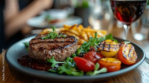 steak, grilled, fries, vegetable, dinner, eatery, meal, food, juicy, delicious, epicure, appetising, plate, lunch, healthy, protein, dinnerware, cooked, seasoned, tender, flavorful, side, dish, red, wine, tomatoes, salad, tasty, cookery, chef, organic