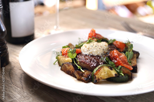 Grilled steak of entrecote with herb butter and grilled vegetables served on a white plate.