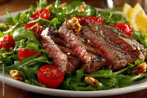 Grilled steak served on a fresh arugula salad with cherry tomatoes and roasted nuts in a cozy dining setting