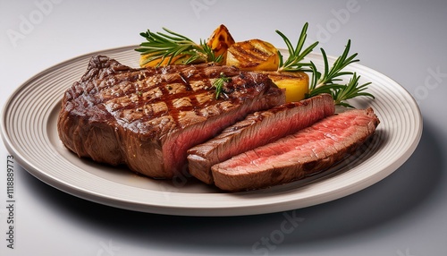 Grilled steak sliced and served with roasted potatoes and rosemary sprigs.