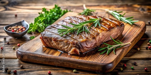 Grilled steak with fresh herbs like parsley and rosemary placed on a wooden cutting board, rosemary