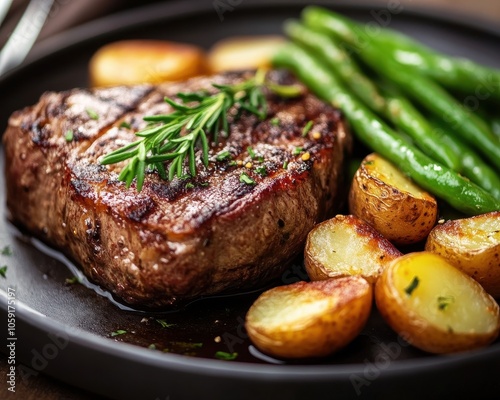 Grilled Steak with Roasted Potatoes and Green Beans on Black Plate
