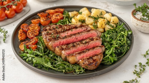 steak, grilled, beef, meat, roasted, tomatoes, potato, arugula, salad, herb, dinner, food, plate, delicious, savoury, meal, cookery, epicure, eatery, accessing, side, dish, healthy, tasty, fresh, juicy, tender, flavorful, summer, spring, autumn, winter, season, receipe, cooking, grill, oven, vegetable, red, green, brown, white, black, grey, dark, light, photo, image