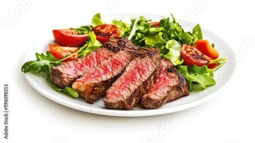 steak, grilled, meat, beef, salad, tomatoes, lettuce, green, red, food, dinner, lunch, receipe, delicious, cookery, meal, protein, healthy, vegetable, fresh, tasty, plate, white, background, isolated, close, up, macro, photo, culinary, epicure, gastronomy, favor, nourishment, diet, cooked, crispy, juicy