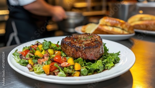Grilled steak with salad served in restaurant kitchen for culinary presentation