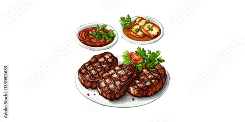 steak, grilled, meat, beef, tomatoes, sauce, garlic, bread, parsley, epicure, dining, culinary, isolated, background, transparent, food, illustration, plate, meal, cookery, delicious, savoury, bar-b-q, dinner, eatery, cooking, garnish, herb, side, dish, roasted, juicy, tender, favor, presentation, art, styling, gastronomy, fine