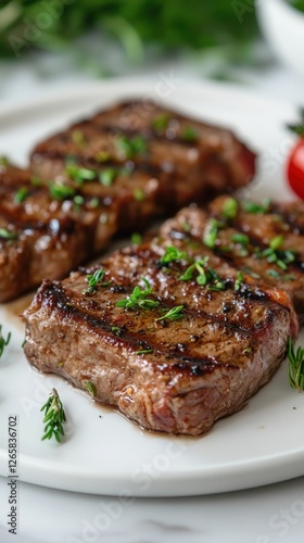grilled, steak, herb, juicy, plate, delicious, dinner, meal, beef, cooked, thyme, savoury, cookery, bar-b-q, epicure, succulent, protein, food, culinary, appetising