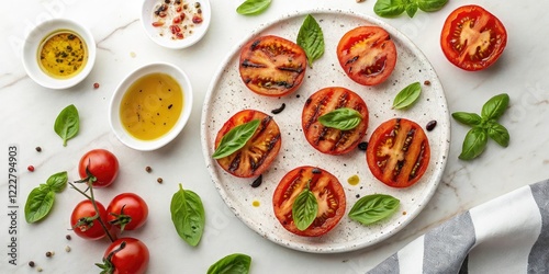 Grilled tomatoes with basil and olive oil arranged in a pattern on a white marble table for a stylish kitchen presentation, olive oil drizzle, herbed oil accents, kitchen decor