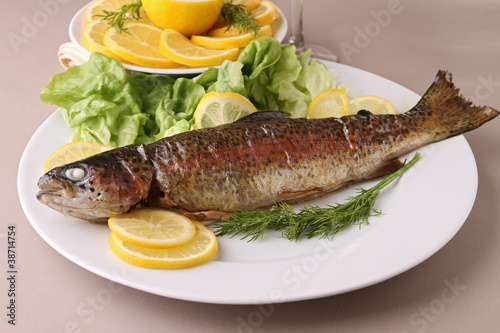 trout, grilled, seafood, fish, lettuce, salad, lemon, food, meal, nourishment, healthy, dinner, lunch, cookery, epicure, eatery