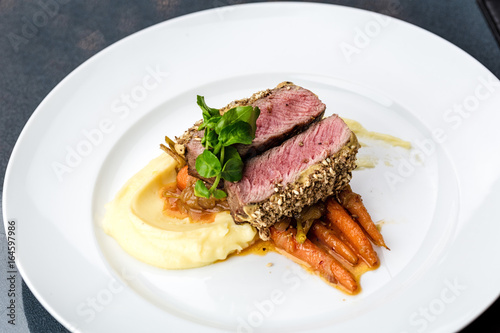 grilled tuna with baby carrot and mashpotato