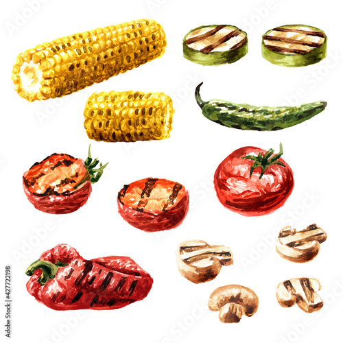 Grilled vegetables and mushrooms set. Watercolor hand drawn illustration, isolated on white background