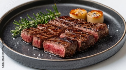 Grilled wagyu beef steak with rosemary and garlic on a plate.