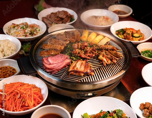 Grilling meat and vegetables on korean barbecue grill with side dishes