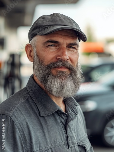 beard, moustache, cap, gas, station, man, facial, hair, fuel, casual attire, wear, male, exterior, signs, street, view, traveling, vehicle, journey, road, trip