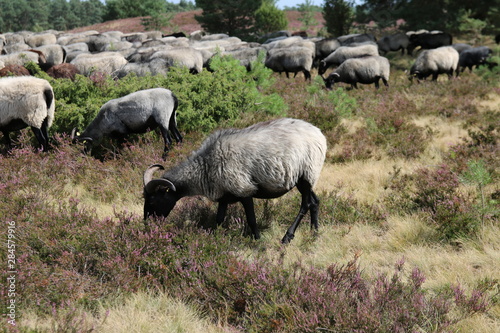 Große Heidschnuckenherde in der blühenden Lüneburger Heide