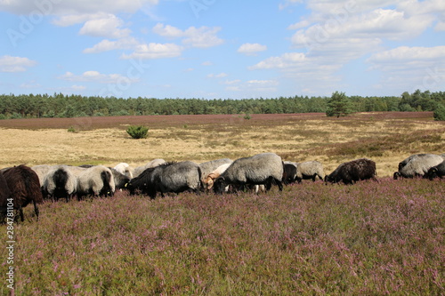 Große Heidschnuckenherde in der blühenden Lüneburger Heide