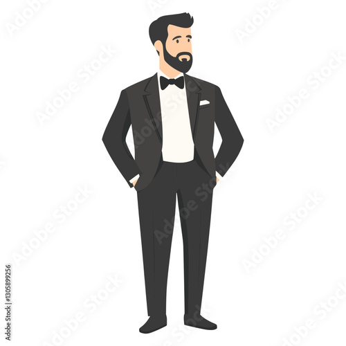 illustration, colours, minimalistic, background, texture, shadow, vector, man, hand, person, business, black, white, suit, bow, transparent, clothing, simple, adult, groom, human, flats, shading, accessory, gentleman, detail, elegant, tuxedo, beard, style, look, pocket, cartoonish, isolated, apparel, bow tie, stylish, coat, male, attaching, pose, attire, formal