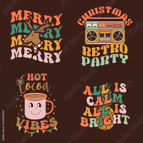 Groovy Christmas prints set with different vintage graphics and quotes-hot cocoa vibes, all is calm all is bright. Retro Christmas graphics. Stock vector clipart on dark background