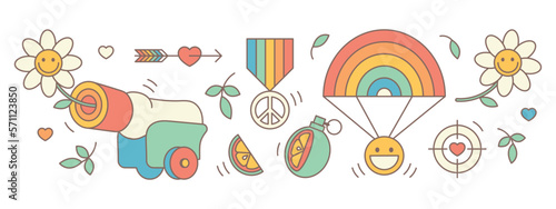 groovy, set, rainbow, arrow, nubes, gun, grenade, chamomile, leaf, tree branch, parachute, sight, target, cupid, love, pacific, positive, peace, war, world peace, trendy, vector, 60s, icon, collection, card, signs, retro, happy, banner, art, cute, smile, peaceful, celebration, freedom, independence, armed, cartoon, defense, flower, military, weapon, logotype, army, sticker, vintage, fun