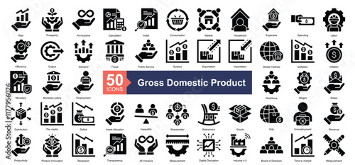 Gross Domestic Product Icon Collection Set.Containing rise, prosperity, all inclusive, calculation, index, consumption, market, household, expenses icon. Simple glyph style Vector Illustration.