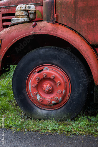 wheel, nut, red, vintage, rust-eaten, car, tire, bucket, vehicle, tire, aged, car, transport, rubber, vintage, car, route, tractor, classic, dirty, yellow, big, dish, metal, detail, construction