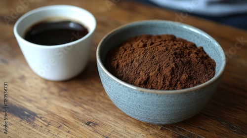 hot drink, ground, cup, bowl, dark, brown, powder, drink, beverage, morning, breakfast, aroma, energy, caffeinated, stimulant, hot, espresso, brew, roasted, bean, grain, delicious, rich, favor, smell, comfort, promoting, cafes, table, wood, wooden, surface, food, cookery