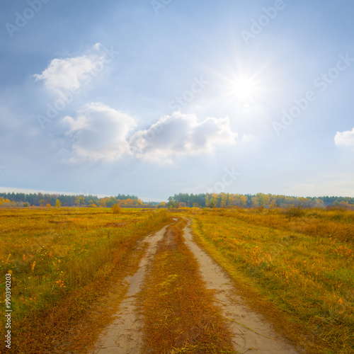 steppe, prairie, grass, plain, field, sky, bright, blue, cloud, sun, sparkle, sunbeam, light, ray, sunshine, sunlight, glow, solar, day, landscape, scene, panoramic, nature, environment, road, ground, rural