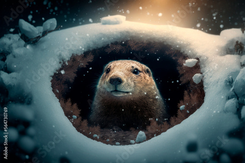 Groundhog covered in snow on Groundhog Day. Generative AI