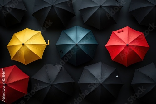 Group of black umbrellas from top view with random placement of three colored ones