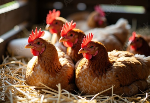 Group of brown hens with red combs resting on straw bedding in a farm setting