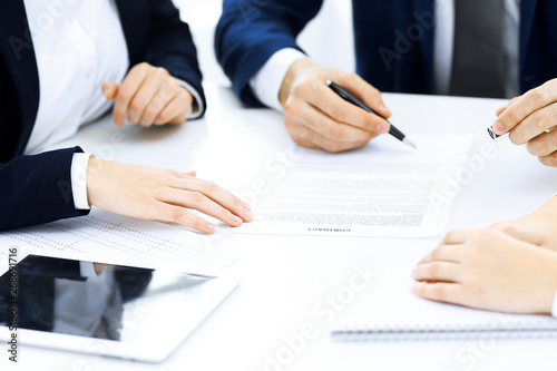 Group of business people and lawyers discussing contract papers sitting at the table, close-up. Successful teamwork, cooperation and agreement concepts