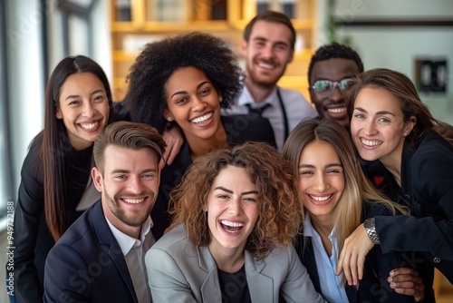 Group of business professionals smiling confidently together. Colleagues pose with relaxed expressions at the office. Leaders and team members collaborate and communicate effectively.