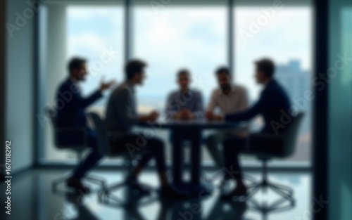 Group of businesspeople negotiating gathered in modern conference room, blurred silhouettes view, meeting behind closed glass doors. AI Generated Images. High quality