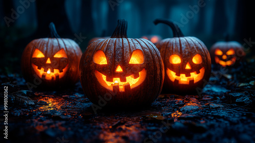 Group of Carved Jack-o'-Lanterns Glowing with Spooky Faces in the Dark