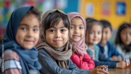 Group of children conducting a chemistry experiment, colorful classroom setting, enthusiastic expressions, scientific curiosity